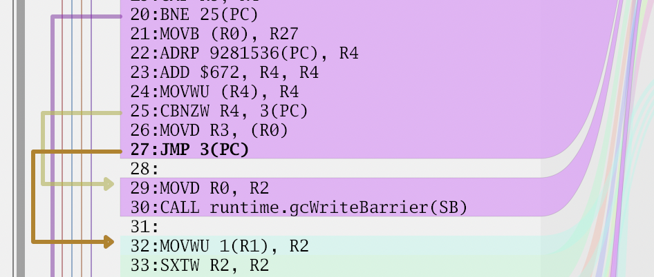 Unfortunately, the objfile library disassembler doesn't expose the information whether the instruction is a jump and when it jumps, then where to. I didn't want to dig too deep into this, so I reached for the usual tool for this – regular expression matching. It seemed that all the jumps ended with a hex number, such as JMP 0x123... of course, that approach broke. On arm processors, they look like BLS 38(PC). I added a special case for it for now, but it'll probably break again on some other platform.